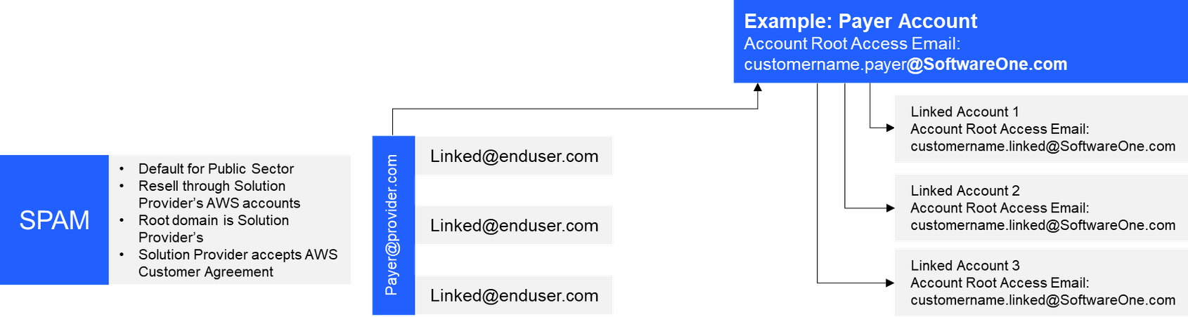 In both resale models, the provider must hold ownership of the master AWS account (payer account). As per the Solution Provider Program model and in line with other partners, SoftwareOne is responsible for the payment of all AWS invoices. Customer is responsible for payment of SoftwareOne invoices. As SoftwareOne owns the legal relationship with AWS, SoftwareOne requires ownership of the root account.