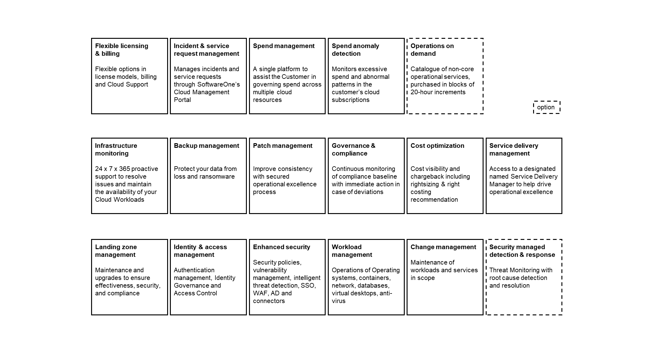Now, customers can direct their attention towards their core business, while SoftwareOne manages their active directory (for systems), operating systems, containers, networks, databases, and virtual desktop farms. SoftwareOne guarantees that their cloud environment is configured and supervised with enhanced security measures, including system authentication management, identity governance, access control, vulnerability management, and threat detection, in order to mitigate potential risks.